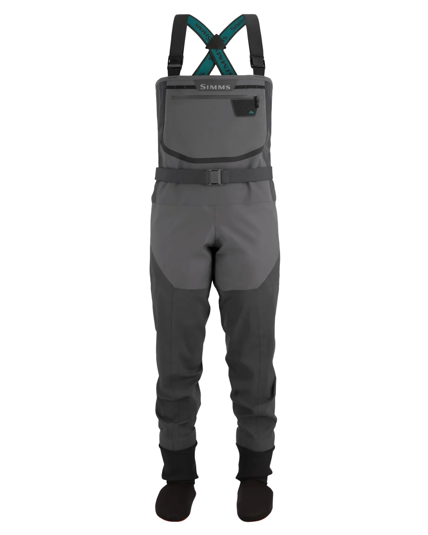 • Stretch elastic suspenders with Simms custom opposing male and female buckles for easy waist-high conversion