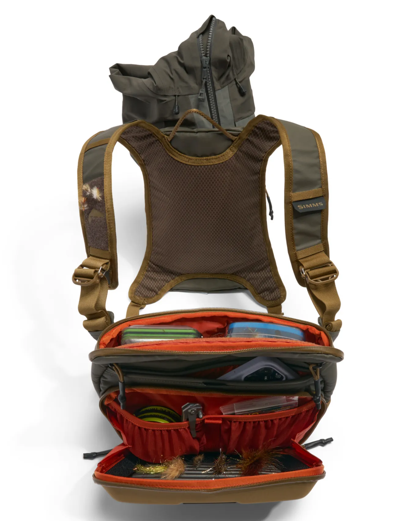 • The back storage compartment is removable and the chest pack is compatible with any Simms waders or the Headwaters backpack
