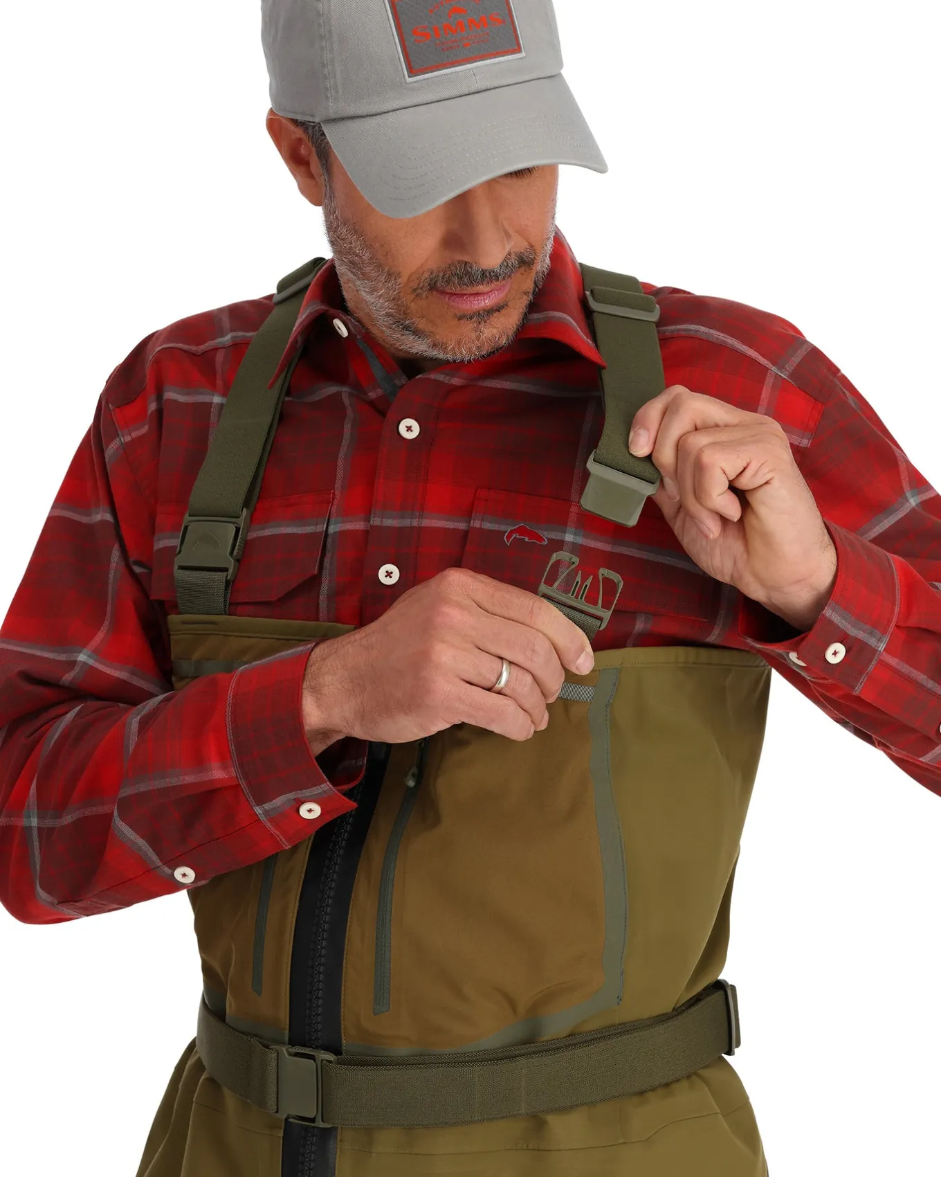 • Stretch elastic suspenders with Simms custom opposing male and female buckles